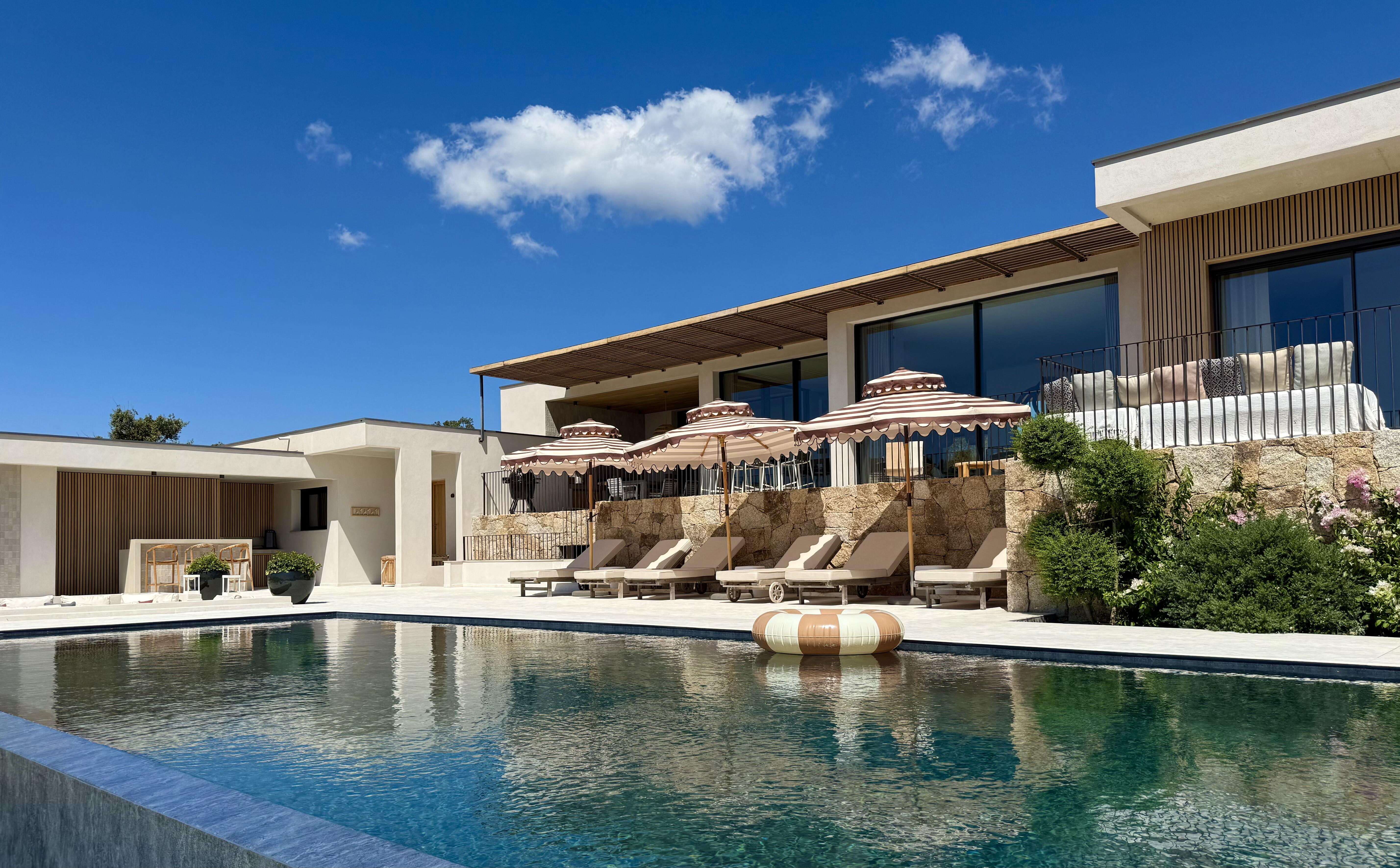 Son style contemporain et ses prestations haut de gamme sauront sublimer votre séjour. D’une surface de 260 m², la villa GIGI se compose comme suit : Dès l’entrée, une pièce à vivre baignée de lumière naturelle s’ouvre sur une cuisine moderne. L’ensemble donne accès, par de grandes baies vitrées minimalistes, à une terrasse couverte avec cuisine d’été. La chambre master, située dans l’aile principale de la maison, est équipée d’un lit king-size, d’un grand dressing et d’une salle de bain aux matériaux nobles, comprenant une double douche à l’italienne, une baignoire, une double vasque, le tout donnant accès à la terrasse principale. Dans l’aile inférieure de la villa, vous découvrirez un patio arboré d’un sublime olivier, autour duquel s’organisent les trois autres chambres. Chacune est dotée d’un lit king-size, d’une salle d’eau et de toilettes privatives. Une porte s’ouvre ensuite sur l’espace extérieur principal : une piscine chauffée de 12 m x 4 m, entourée de six transats ombragés par de beaux parasols à rayures. Vous y trouverez également un coin bar abrité, équipé d’un réfrigérateur, d’une machine à café et d’un évier, ainsi qu’un large salon encastré de type conversation pit, idéal pour des moments conviviaux au bord de l’eau.