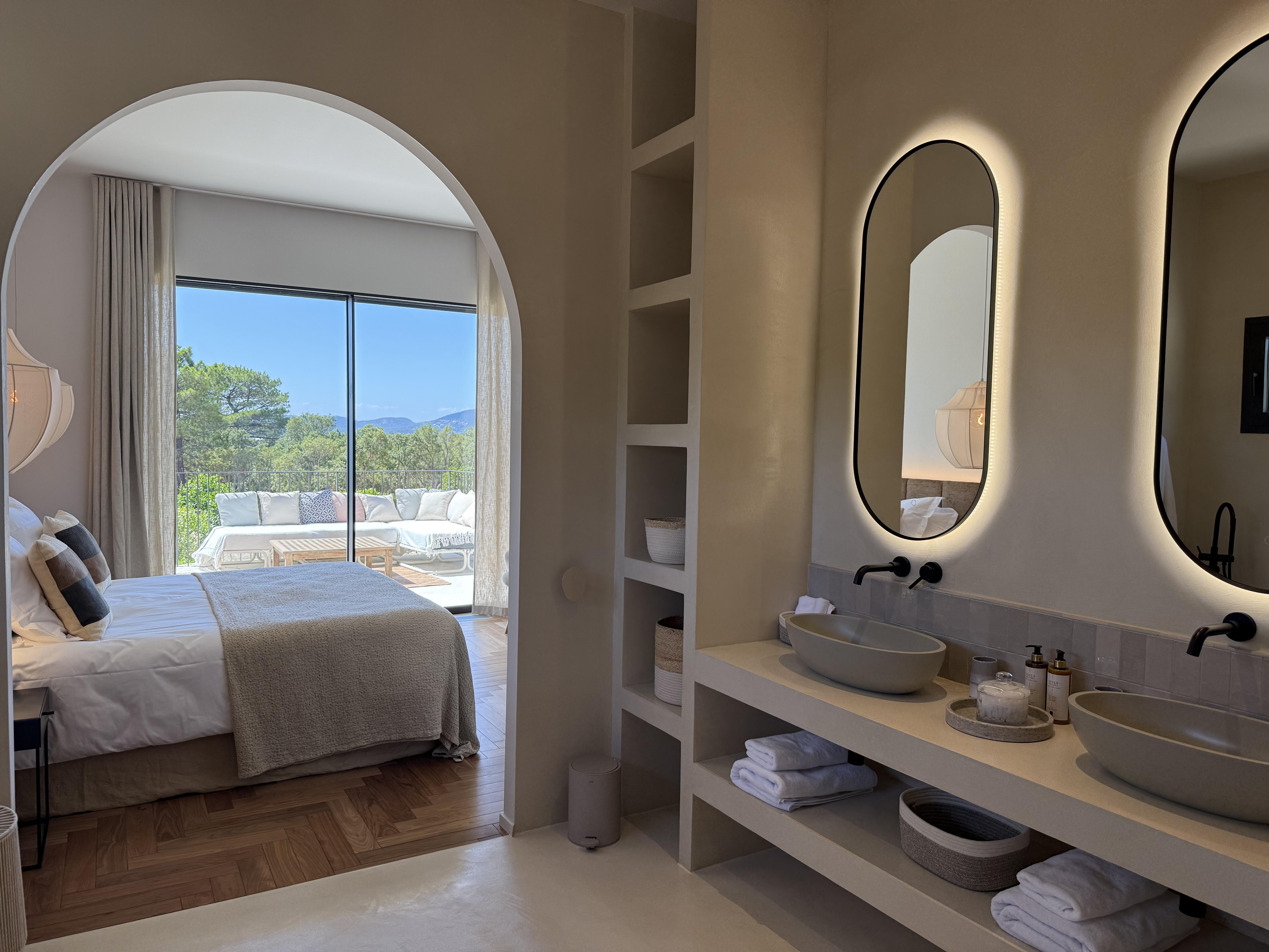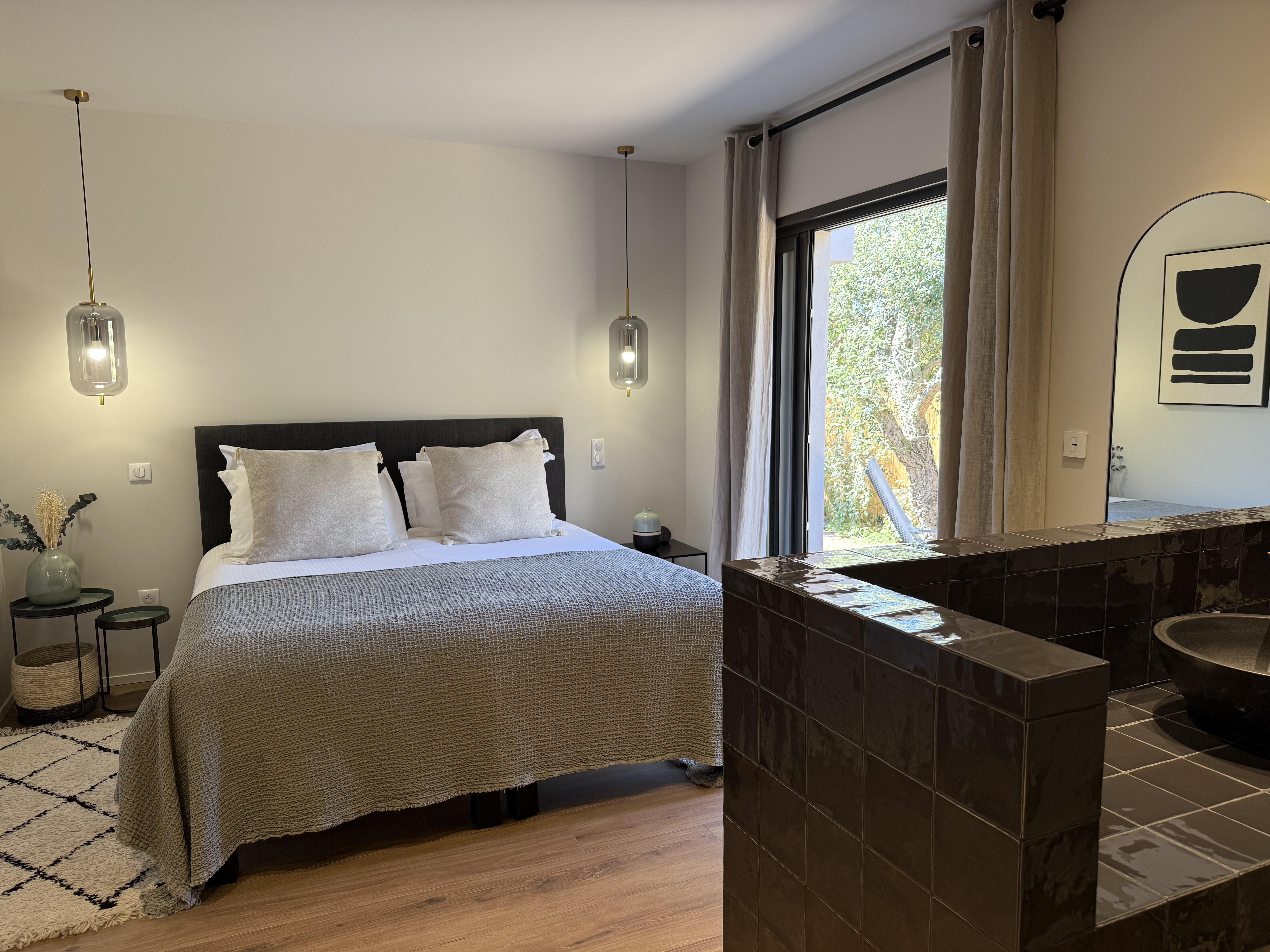 Chambre 1 : Lit king-size 180cm, salle de bain avec douche à l'italienne et WC, Smart TV, table de bureau, dressing, terrasse.