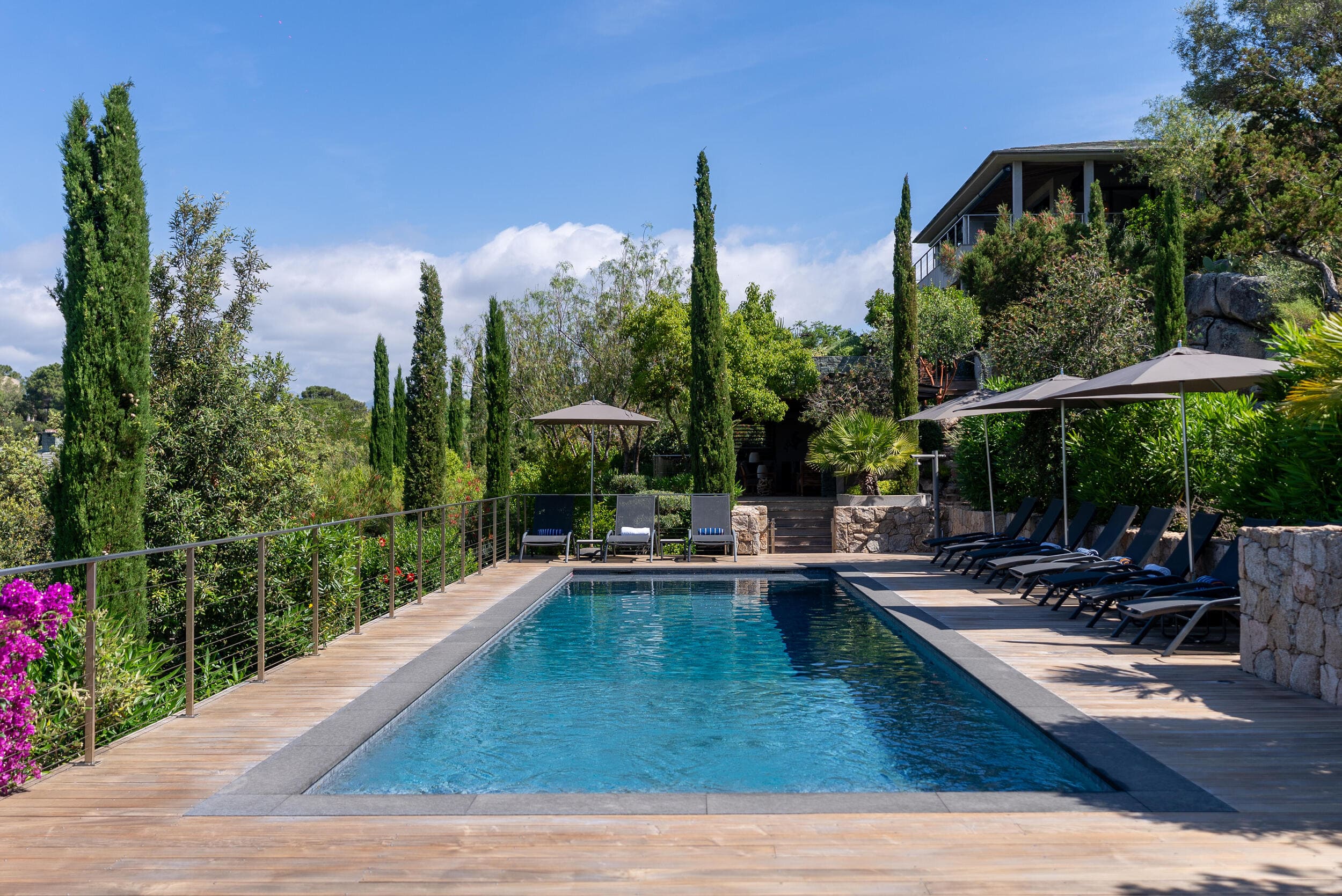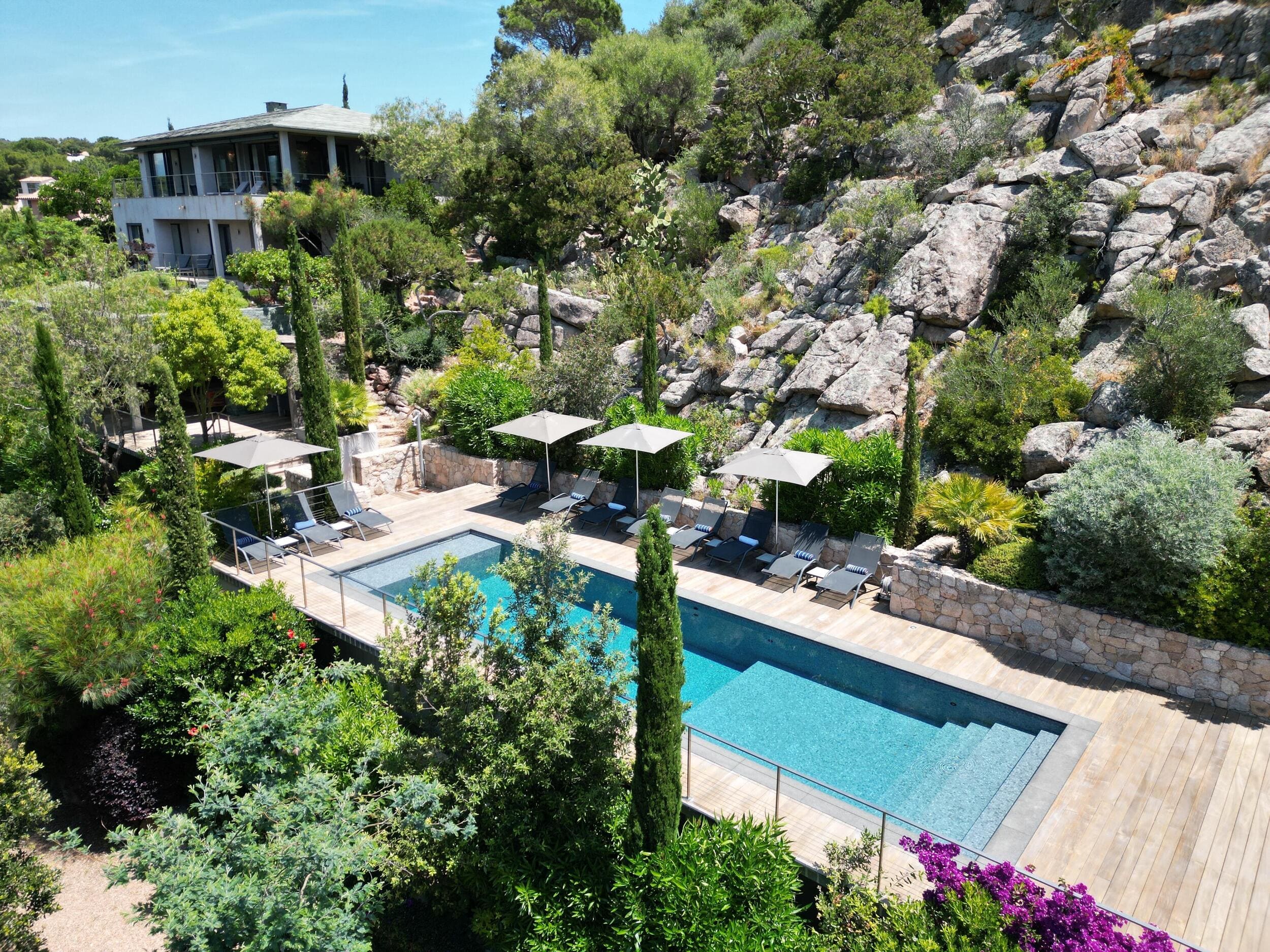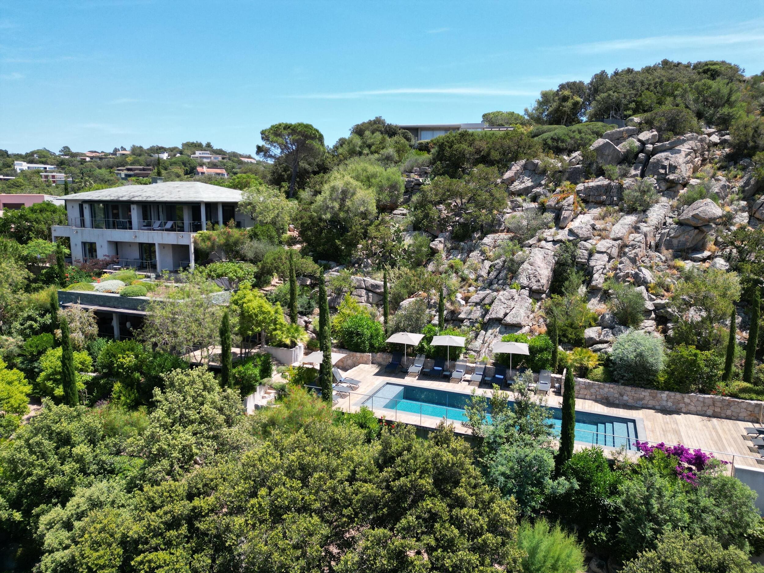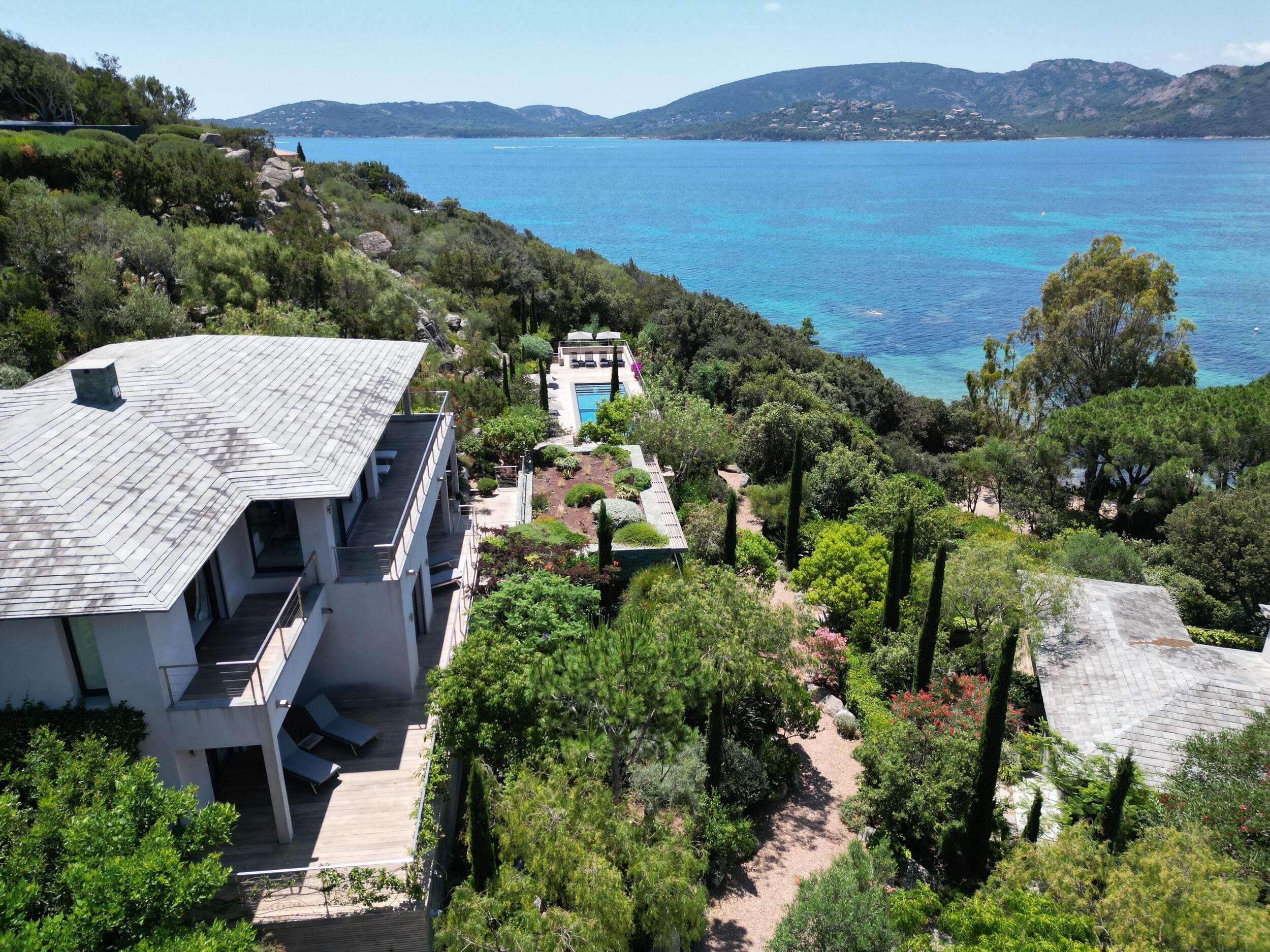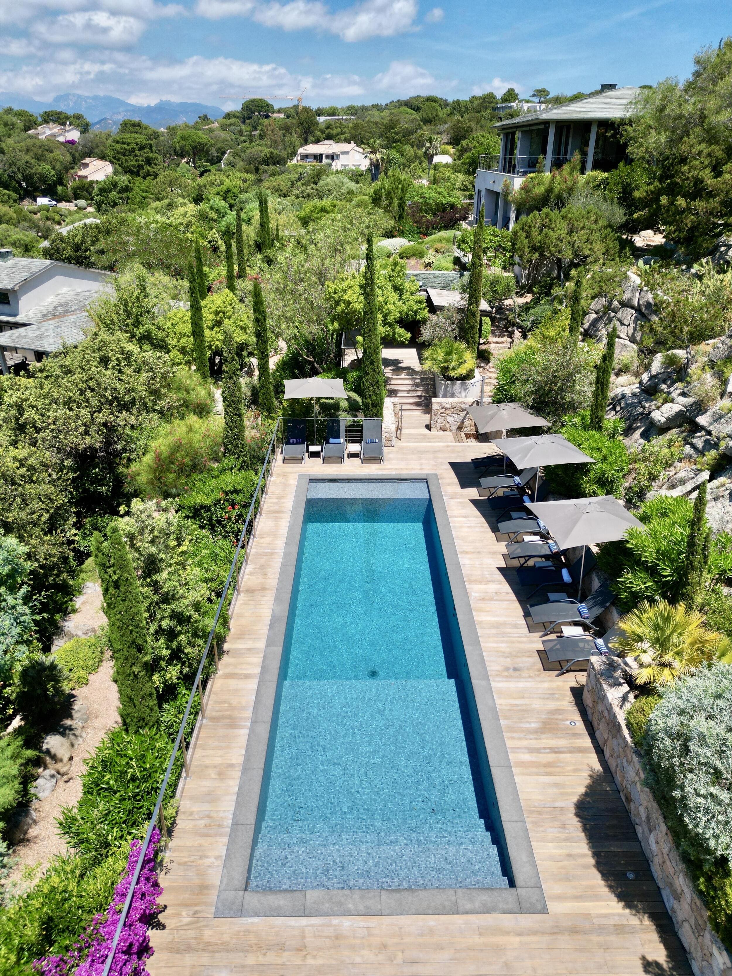 La Villa BEX vous enivrera de sa beauté: en arrivant sur place vous serez accueilli par un magnifique enrochement aménagé d’essences locales tels que les palmiers, oliviers, romarin, immortelles, ….un véritable plaisir pour l’odorat et la vue.En poussant la porte d’entrée laissez – vous charmer par la vue mer à couper le souffle sur le golfe de Porto-Vecchio.La villa se dévoile sur trois niveaux:*Au niveau principal double salon/TV avec salle à manger, cuisine entièrement équipée et aménagée, cellier, vestiaire pour invités avec WC et lave main. Le tout donnant accès à une grande terrasse semi couverte et agrémentée d’une table d’extérieure/barbecue*Un escalier permet d’accéder au niveau inférieur qui est l’espace nuit de la villa: 4 chambres magnifiquement décorées vous attendent avec la buanderie qui est entièrement équipée et aménagée. Les chambres se composent comme suit:Chambre 1 : Master Room avec lit en 180X200 cm, grand dressing, salle de bain (douche + baignoire), WC, terrasse permettant d’accéder à la piscine.Chambre 2 :lit en 180 cm, placard, séparément salle d'eau avec WC, terrasse avec accès piscineChambre 3 : lit en 180 cm, dressing, terrasse et salle d’eau avec WC.Chambre 4: lit en 180 cm, dressing séparé, salle de bain (douche + baignoire) avec WC *Enfin un escalier vous permet d’accéder au rez de jardin qui est un véritable espace détente: salle de sport, salle de massage et pool house. - Cuisine intérieure d’été entièrement équipée et aménagée. - Vous aurez accès à une terrasse semi couverte pour profiter pleinement des joies de la farniente. - La piscine dispose d’une protection enfant (rideau roulant), transat et parasols. - Une douche extérieure est également présente. L’ambiance est réellement reposante, dépaysante et charmante. La villa GRYON, alliant classicisme et modernisme, offre des prestations très haut de gamme, tant dans le mobilier que dans le choix des détails et se compose comme suit:*L'entrée se fait par une approche totalement verdoyante avec un véritable jardin d'Eden: plantes endémiques et exotiques vous mènent via un dallage de pierres de Brando à la porte d'entrée en bois massif: un hall d'entrée vous accueille vers une pièce de vie principale en total open space très lumineux: grand salon d'angle, TV avec chaines satellites, salle à manger, cuisine ouverte avec comptoir. Cette dernière, entièrement aménagée et équipée dispose de tous les éléments nécessaires: double four, double chauffe plat, plaque vitro céramique, machine à café Nespresso... Attenant se trouve un cellier avec cave à vin.*L'espace nuit se compose de 4 chambres (+ 1 pour enfant avec llit en 90 cm ou dite de service):A l'étage se trouve la Master Room de la villa avec lit en 180X200 cm, TV avec Apple TV, dressing indépendant, coffre fort, terrasse privative avec vue jardin et mer. Salle de bain avec douche et baignoire, double vasque, WCAu 1/2 niveau inférieur se trouve:un WC invitéchambre 2: lit en 140 cm, placard, salle d'eau avec WC, terrassechambre 3: lit en 180 cm, placard, terrasse et salle de bain (douche + baignoire) avec WC commun avec la chambre dite de 'service' ou destiné à un petit enfant (lit en 90 cm):chambre 4: accès extérieur et indépendant, lit en 140 cm salle d'eau avec WC. Par cet accès extérieur et indépendant de la villa vous aurez également à disposition un cellier avec cave à vin, réfrigérateur, une buanderie totalement équipée et aménagée et surtout une salle de cinéma disposant de deux canapés confortables. Cette chambre peut être destiné à du personnel de service.Les espaces extérieurs sont agrémentés d'essences locales et plus exotiques: vous serez charmés par l'ambiance qui en ressort, un coin été est également prévu avec une table extérieure ombragée. L'accès à la plage se fait en moins de 5 minutes à pied via le jardin des villas.