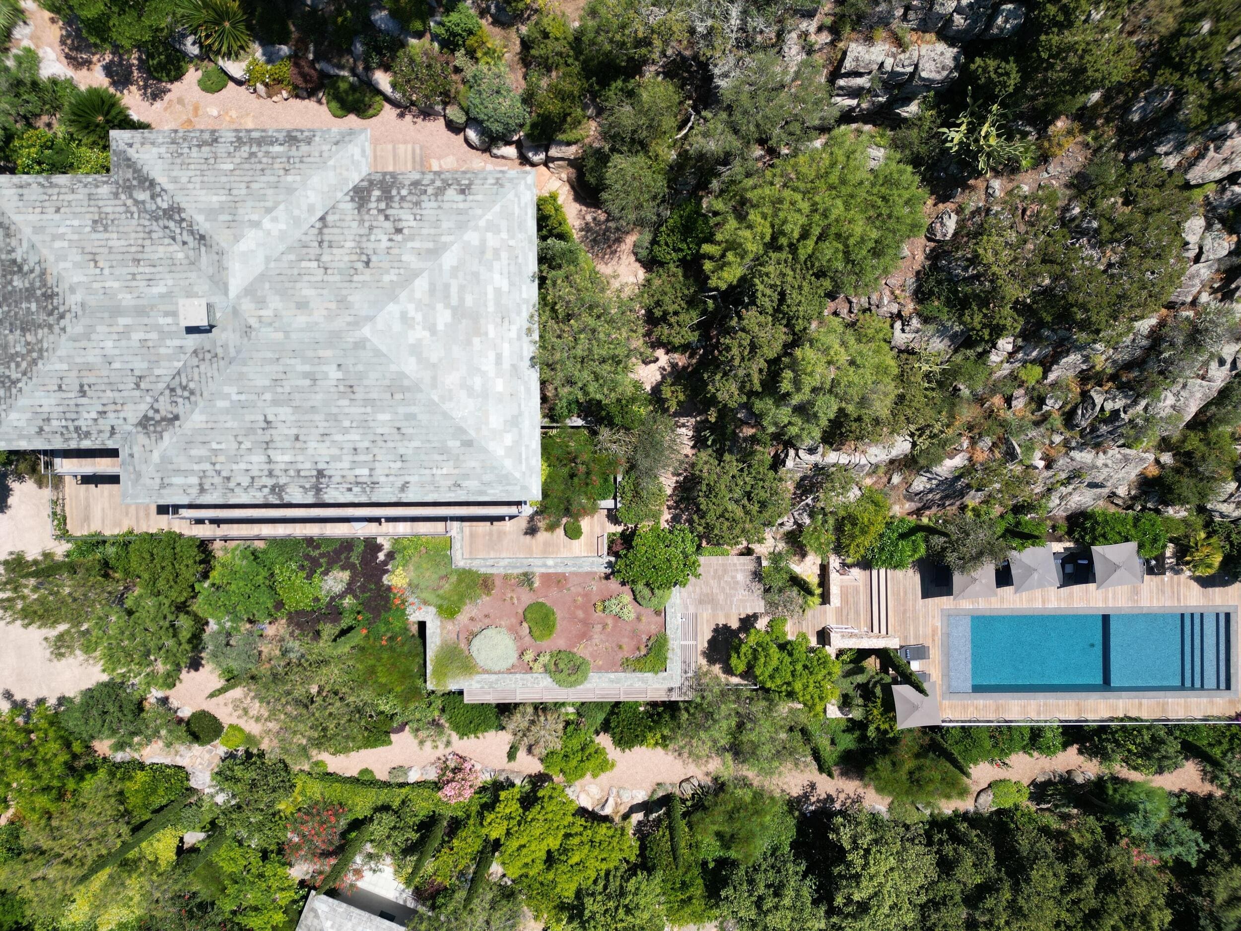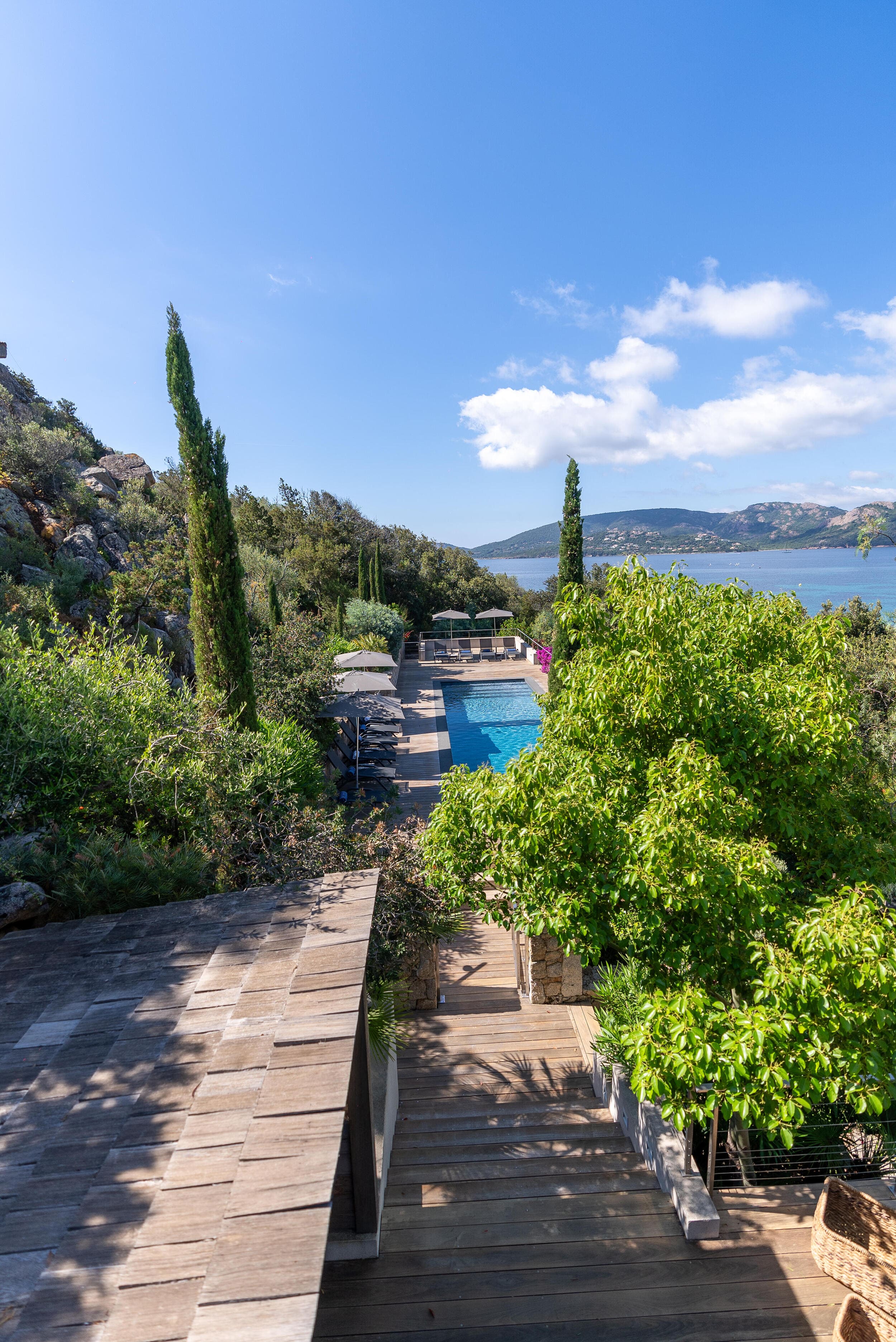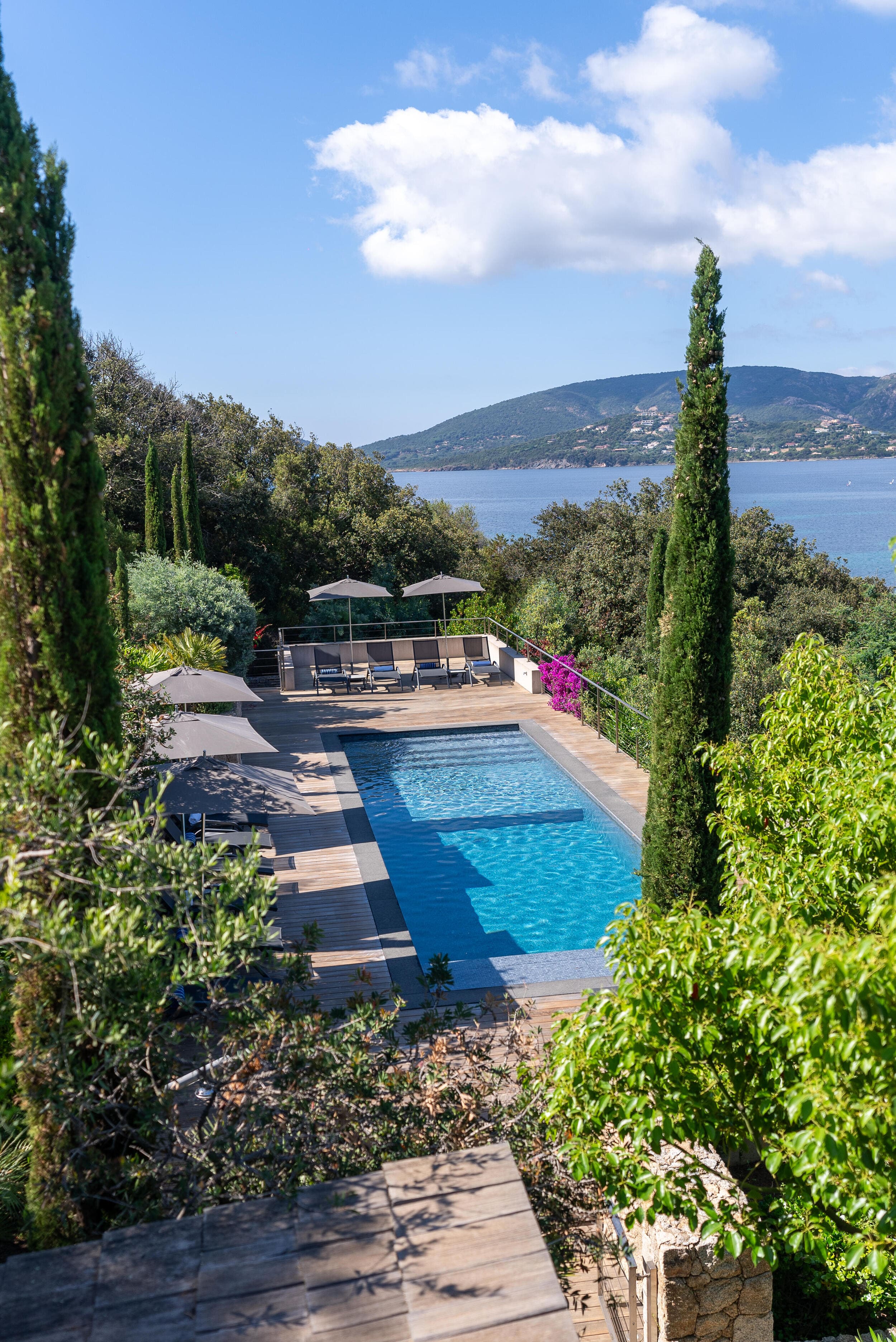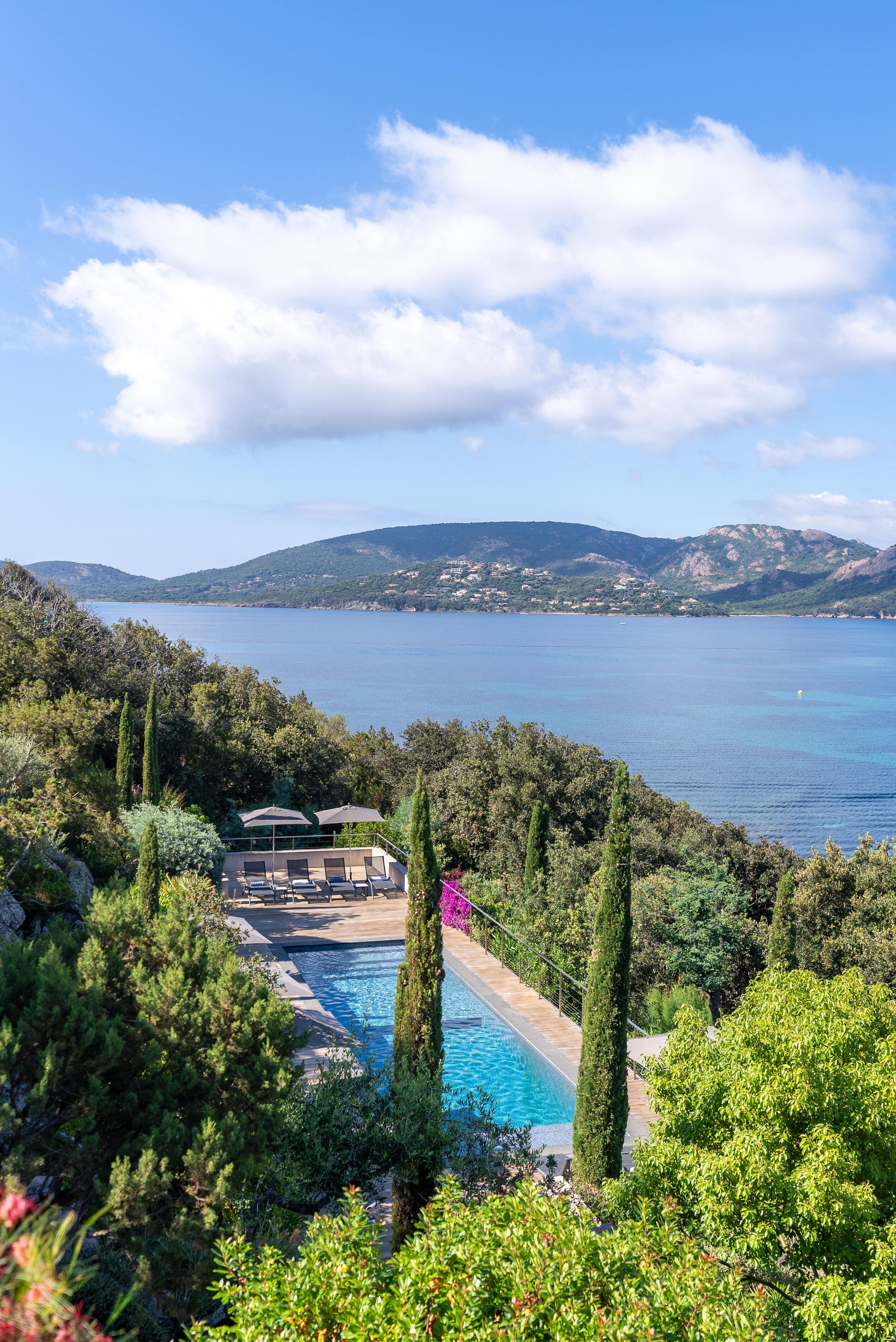 La Villa BEX vous enivrera de sa beauté: en arrivant sur place vous serez accueilli par un magnifique enrochement aménagé d’essences locales tels que les palmiers, oliviers, romarin, immortelles, ….un véritable plaisir pour l’odorat et la vue.En poussant la porte d’entrée laissez – vous charmer par la vue mer à couper le souffle sur le golfe de Porto-Vecchio.La villa se dévoile sur trois niveaux:*Au niveau principal double salon/TV avec salle à manger, cuisine entièrement équipée et aménagée, cellier, vestiaire pour invités avec WC et lave main. Le tout donnant accès à une grande terrasse semi couverte et agrémentée d’une table d’extérieure/barbecue*Un escalier permet d’accéder au niveau inférieur qui est l’espace nuit de la villa: 4 chambres magnifiquement décorées vous attendent avec la buanderie qui est entièrement équipée et aménagée. Les chambres se composent comme suit:Chambre 1 : Master Room avec lit en 180X200 cm, grand dressing, salle de bain (douche + baignoire), WC, terrasse permettant d’accéder à la piscine.Chambre 2 :lit en 180 cm, placard, séparément salle d'eau avec WC, terrasse avec accès piscineChambre 3 : lit en 180 cm, dressing, terrasse et salle d’eau avec WC.Chambre 4: lit en 180 cm, dressing séparé, salle de bain (douche + baignoire) avec WC *Enfin un escalier vous permet d’accéder au rez de jardin qui est un véritable espace détente: salle de sport, salle de massage et pool house. - Cuisine intérieure d’été entièrement équipée et aménagée. - Vous aurez accès à une terrasse semi couverte pour profiter pleinement des joies de la farniente. - La piscine dispose d’une protection enfant (rideau roulant), transat et parasols. - Une douche extérieure est également présente. L’ambiance est réellement reposante, dépaysante et charmante. La villa GRYON, alliant classicisme et modernisme, offre des prestations très haut de gamme, tant dans le mobilier que dans le choix des détails et se compose comme suit:*L'entrée se fait par une approche totalement verdoyante avec un véritable jardin d'Eden: plantes endémiques et exotiques vous mènent via un dallage de pierres de Brando à la porte d'entrée en bois massif: un hall d'entrée vous accueille vers une pièce de vie principale en total open space très lumineux: grand salon d'angle, TV avec chaines satellites, salle à manger, cuisine ouverte avec comptoir. Cette dernière, entièrement aménagée et équipée dispose de tous les éléments nécessaires: double four, double chauffe plat, plaque vitro céramique, machine à café Nespresso... Attenant se trouve un cellier avec cave à vin.*L'espace nuit se compose de 4 chambres (+ 1 pour enfant avec llit en 90 cm ou dite de service):A l'étage se trouve la Master Room de la villa avec lit en 180X200 cm, TV avec Apple TV, dressing indépendant, coffre fort, terrasse privative avec vue jardin et mer. Salle de bain avec douche et baignoire, double vasque, WCAu 1/2 niveau inférieur se trouve:un WC invitéchambre 2: lit en 140 cm, placard, salle d'eau avec WC, terrassechambre 3: lit en 180 cm, placard, terrasse et salle de bain (douche + baignoire) avec WC commun avec la chambre dite de 'service' ou destiné à un petit enfant (lit en 90 cm):chambre 4: accès extérieur et indépendant, lit en 140 cm salle d'eau avec WC. Par cet accès extérieur et indépendant de la villa vous aurez également à disposition un cellier avec cave à vin, réfrigérateur, une buanderie totalement équipée et aménagée et surtout une salle de cinéma disposant de deux canapés confortables. Cette chambre peut être destiné à du personnel de service.Les espaces extérieurs sont agrémentés d'essences locales et plus exotiques: vous serez charmés par l'ambiance qui en ressort, un coin été est également prévu avec une table extérieure ombragée. L'accès à la plage se fait en moins de 5 minutes à pied via le jardin des villas.