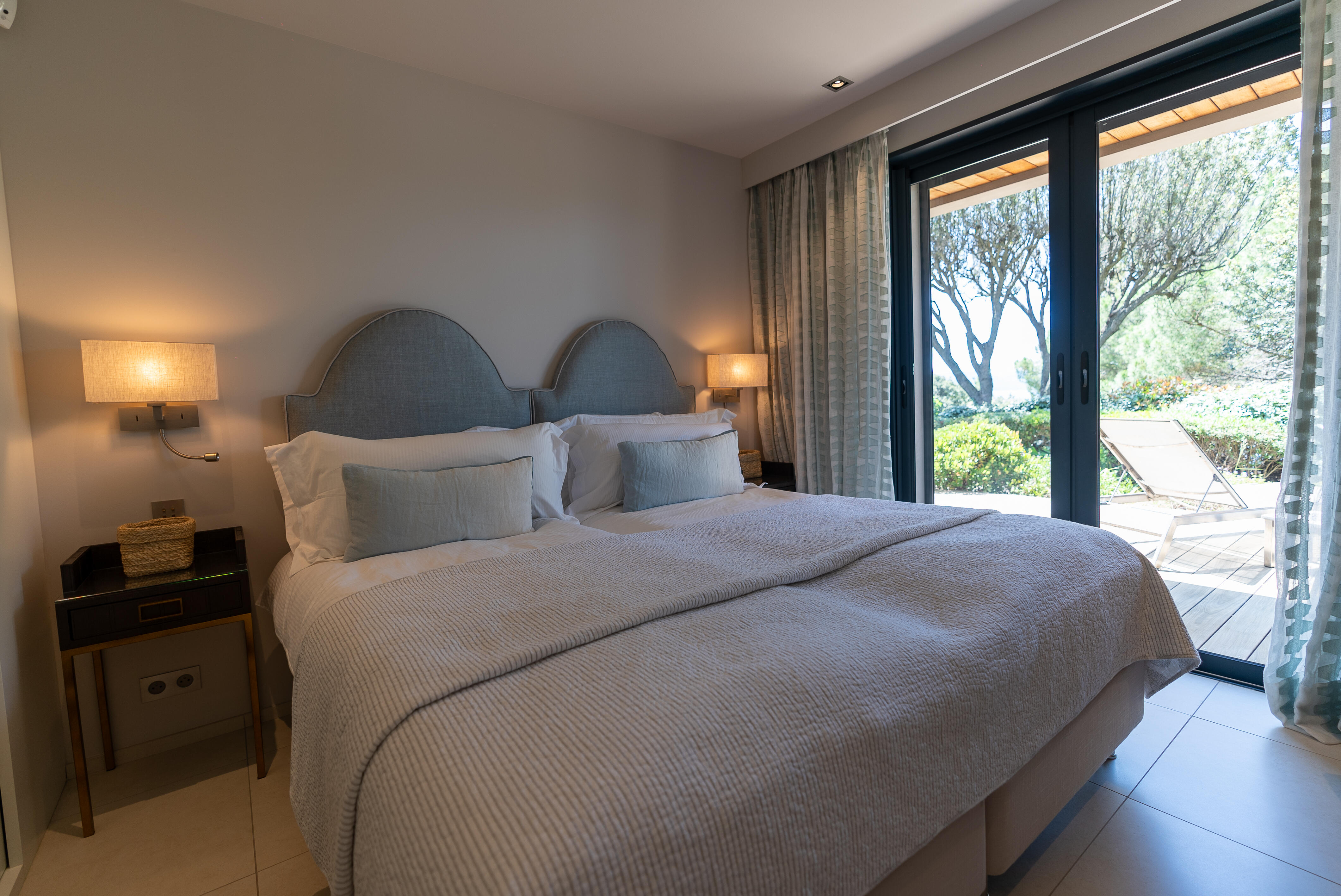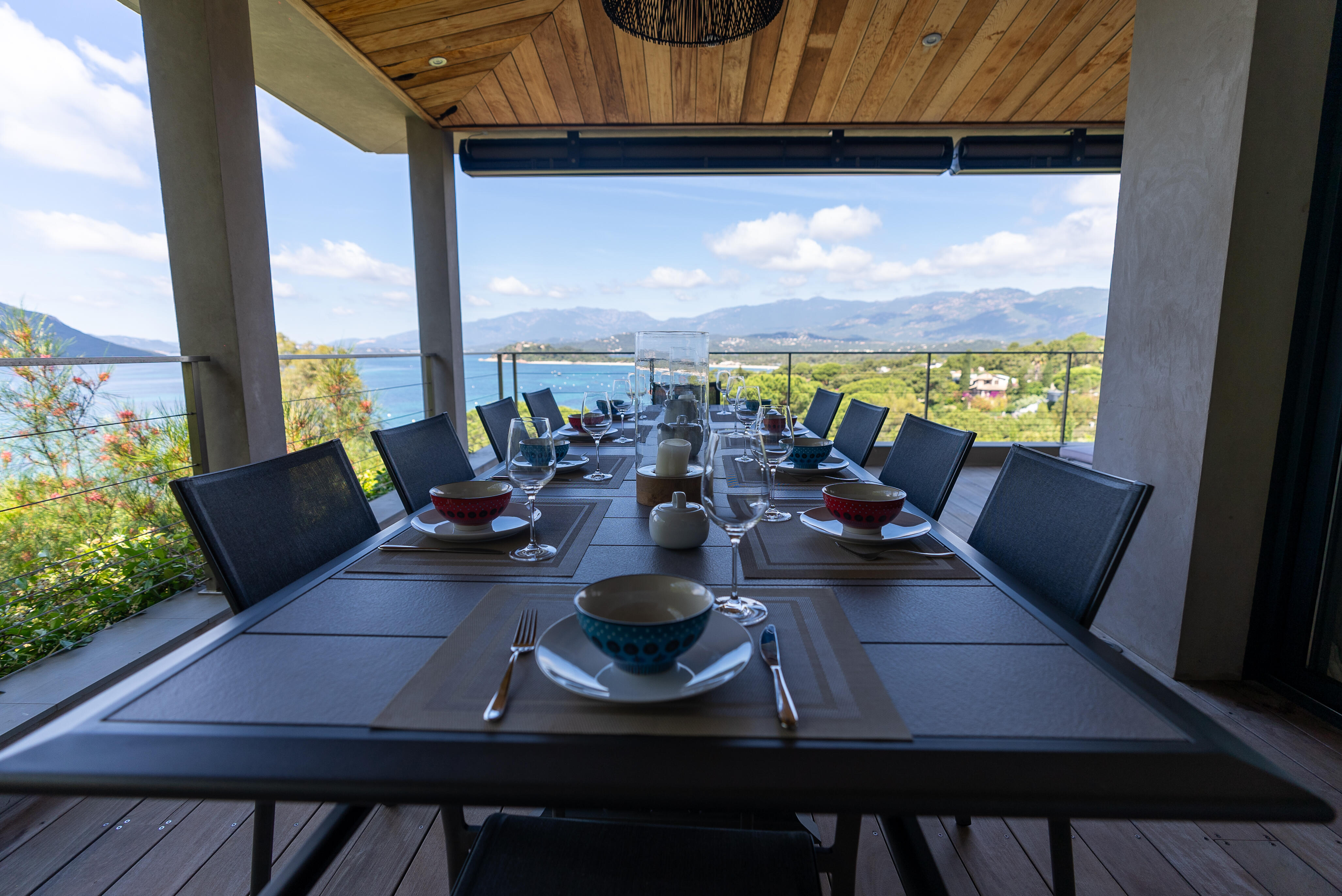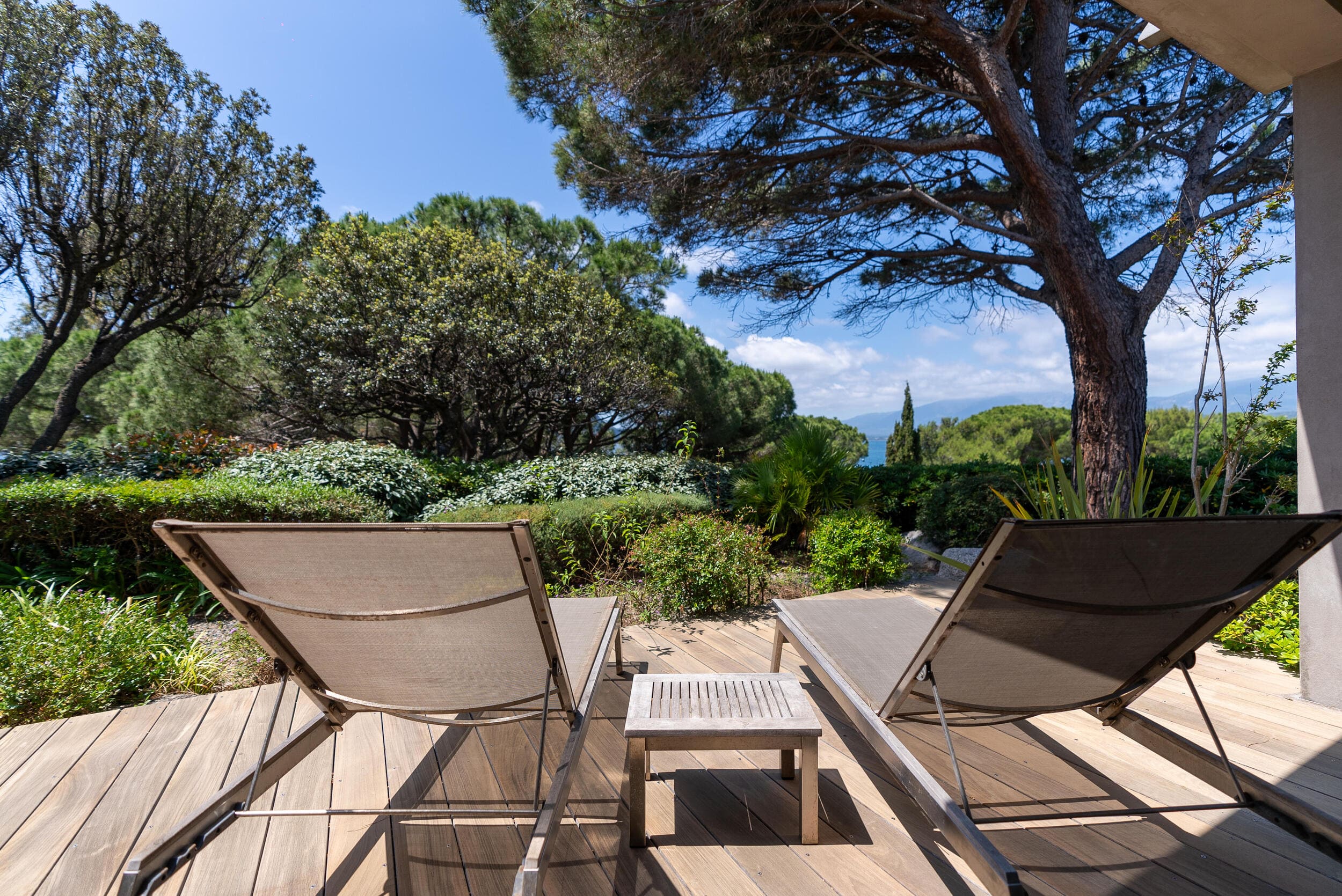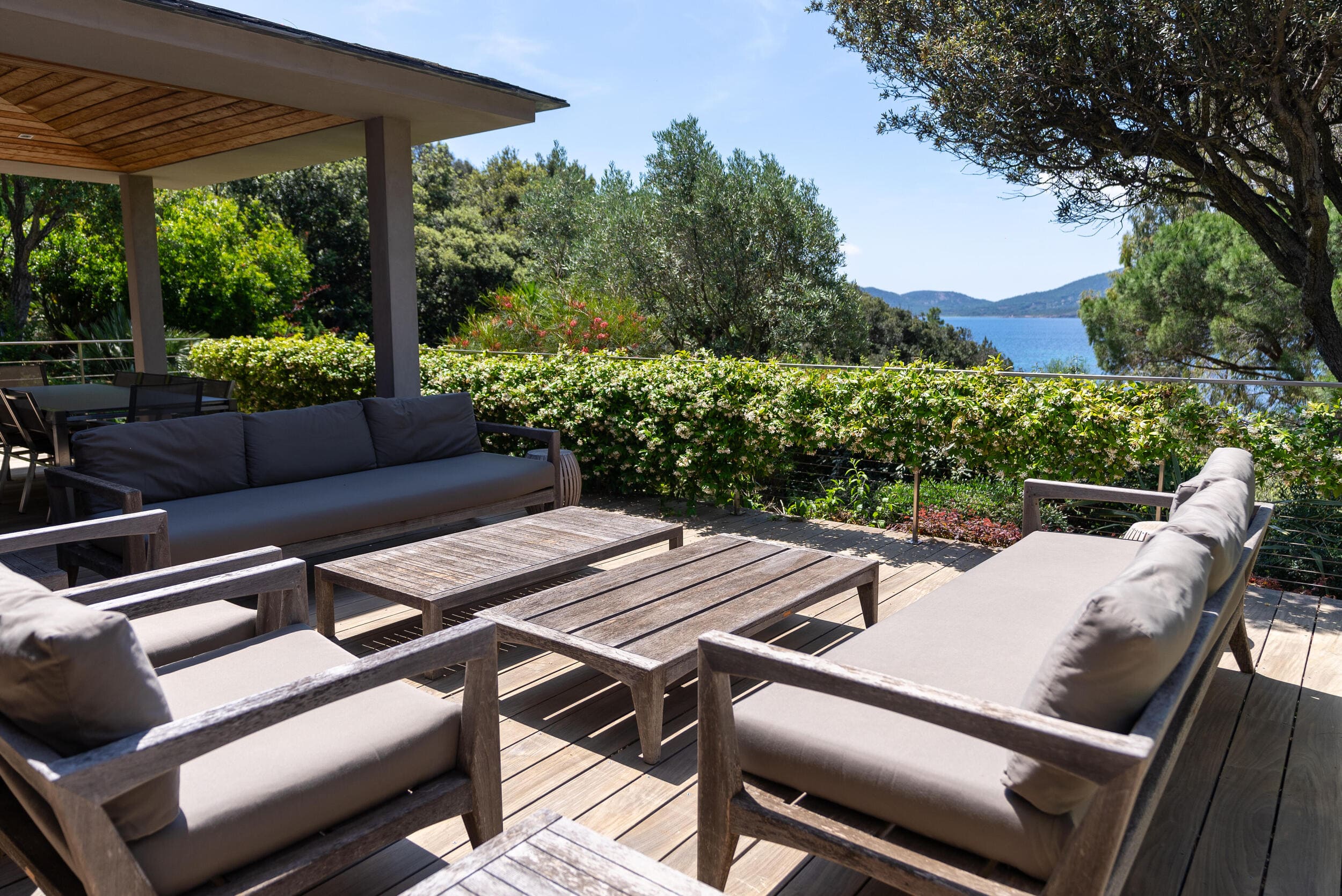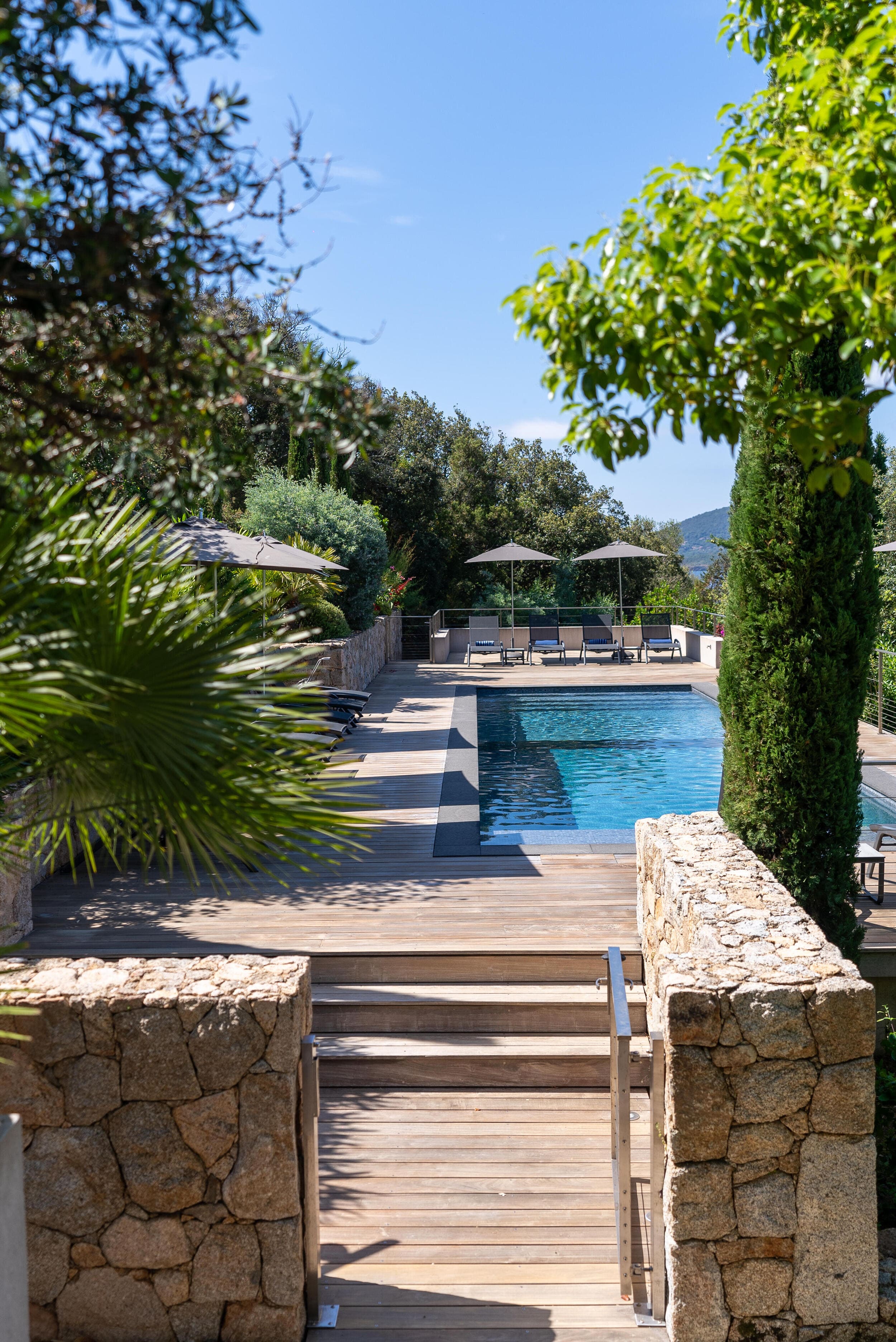 La Villa BEX vous enivrera de sa beauté: en arrivant sur place vous serez accueilli par un magnifique enrochement aménagé d’essences locales tels que les palmiers, oliviers, romarin, immortelles, ….un véritable plaisir pour l’odorat et la vue.En poussant la porte d’entrée laissez – vous charmer par la vue mer à couper le souffle sur le golfe de Porto-Vecchio.La villa se dévoile sur trois niveaux:*Au niveau principal double salon/TV avec salle à manger, cuisine entièrement équipée et aménagée, cellier, vestiaire pour invités avec WC et lave main. Le tout donnant accès à une grande terrasse semi couverte et agrémentée d’une table d’extérieure/barbecue*Un escalier permet d’accéder au niveau inférieur qui est l’espace nuit de la villa: 4 chambres magnifiquement décorées vous attendent avec la buanderie qui est entièrement équipée et aménagée. Les chambres se composent comme suit:Chambre 1 : Master Room avec lit en 180X200 cm, grand dressing, salle de bain (douche + baignoire), WC, terrasse permettant d’accéder à la piscine.Chambre 2 :lit en 180 cm, placard, séparément salle d'eau avec WC, terrasse avec accès piscineChambre 3 : lit en 180 cm, dressing, terrasse et salle d’eau avec WC.Chambre 4: lit en 180 cm, dressing séparé, salle de bain (douche + baignoire) avec WC *Enfin un escalier vous permet d’accéder au rez de jardin qui est un véritable espace détente: salle de sport, salle de massage et pool house. - Cuisine intérieure d’été entièrement équipée et aménagée. - Vous aurez accès à une terrasse semi couverte pour profiter pleinement des joies de la farniente. - La piscine dispose d’une protection enfant (rideau roulant), transat et parasols. - Une douche extérieure est également présente. L’ambiance est réellement reposante, dépaysante et charmante. La villa GRYON, alliant classicisme et modernisme, offre des prestations très haut de gamme, tant dans le mobilier que dans le choix des détails et se compose comme suit:*L'entrée se fait par une approche totalement verdoyante avec un véritable jardin d'Eden: plantes endémiques et exotiques vous mènent via un dallage de pierres de Brando à la porte d'entrée en bois massif: un hall d'entrée vous accueille vers une pièce de vie principale en total open space très lumineux: grand salon d'angle, TV avec chaines satellites, salle à manger, cuisine ouverte avec comptoir. Cette dernière, entièrement aménagée et équipée dispose de tous les éléments nécessaires: double four, double chauffe plat, plaque vitro céramique, machine à café Nespresso... Attenant se trouve un cellier avec cave à vin.*L'espace nuit se compose de 4 chambres (+ 1 pour enfant avec llit en 90 cm ou dite de service):A l'étage se trouve la Master Room de la villa avec lit en 180X200 cm, TV avec Apple TV, dressing indépendant, coffre fort, terrasse privative avec vue jardin et mer. Salle de bain avec douche et baignoire, double vasque, WCAu 1/2 niveau inférieur se trouve:un WC invitéchambre 2: lit en 140 cm, placard, salle d'eau avec WC, terrassechambre 3: lit en 180 cm, placard, terrasse et salle de bain (douche + baignoire) avec WC commun avec la chambre dite de 'service' ou destiné à un petit enfant (lit en 90 cm):chambre 4: accès extérieur et indépendant, lit en 140 cm salle d'eau avec WC. Par cet accès extérieur et indépendant de la villa vous aurez également à disposition un cellier avec cave à vin, réfrigérateur, une buanderie totalement équipée et aménagée et surtout une salle de cinéma disposant de deux canapés confortables. Cette chambre peut être destiné à du personnel de service.Les espaces extérieurs sont agrémentés d'essences locales et plus exotiques: vous serez charmés par l'ambiance qui en ressort, un coin été est également prévu avec une table extérieure ombragée. L'accès à la plage se fait en moins de 5 minutes à pied via le jardin des villas.