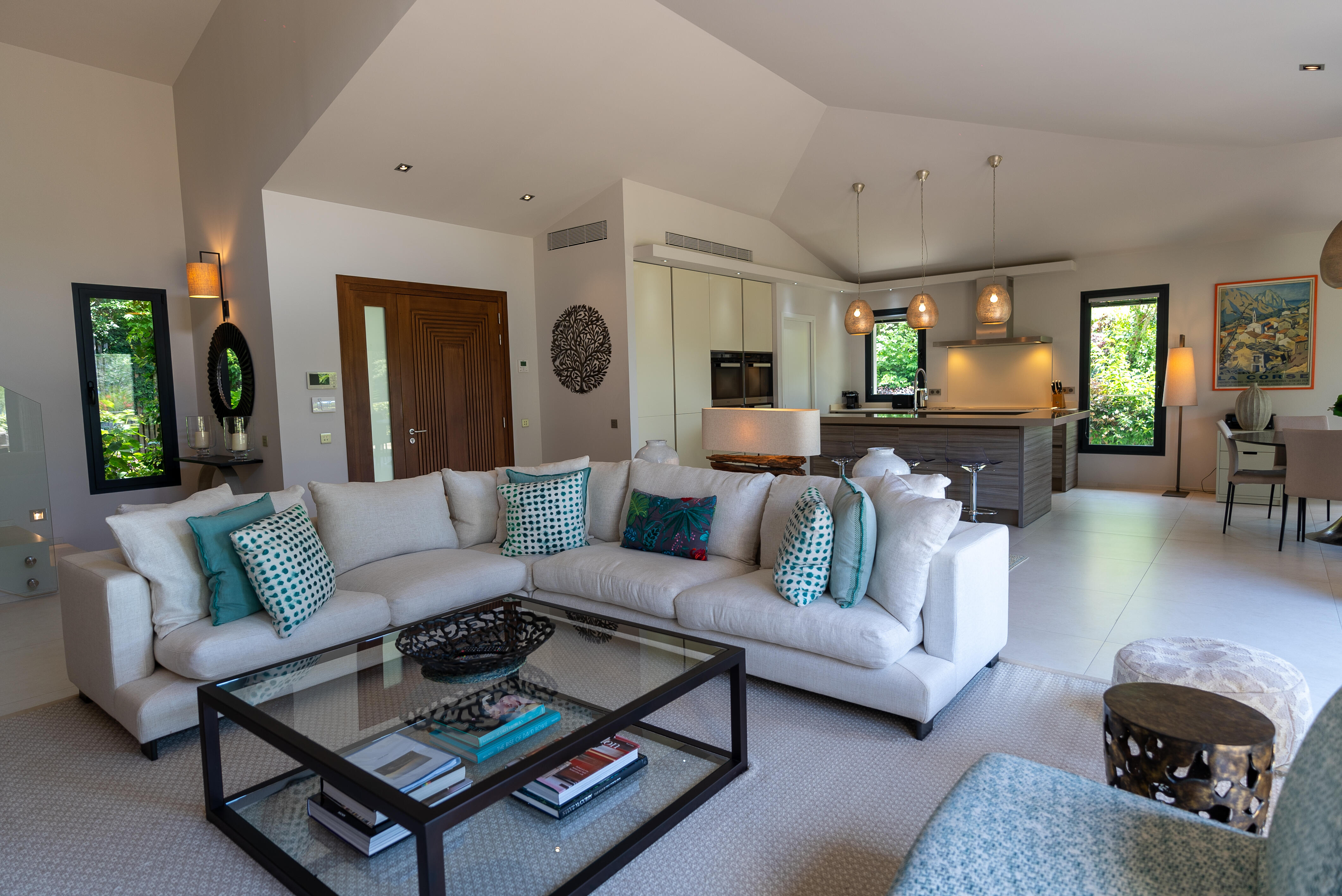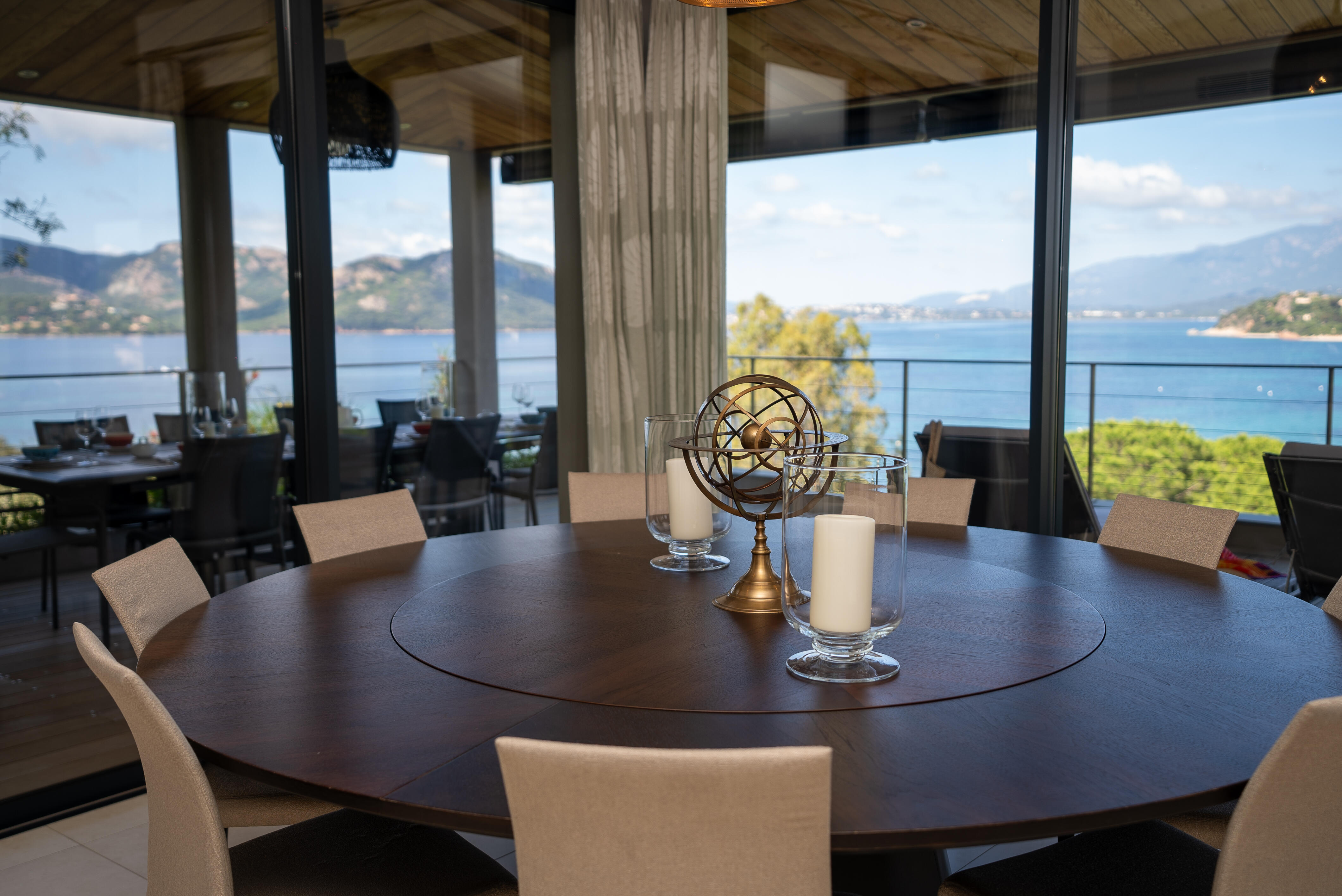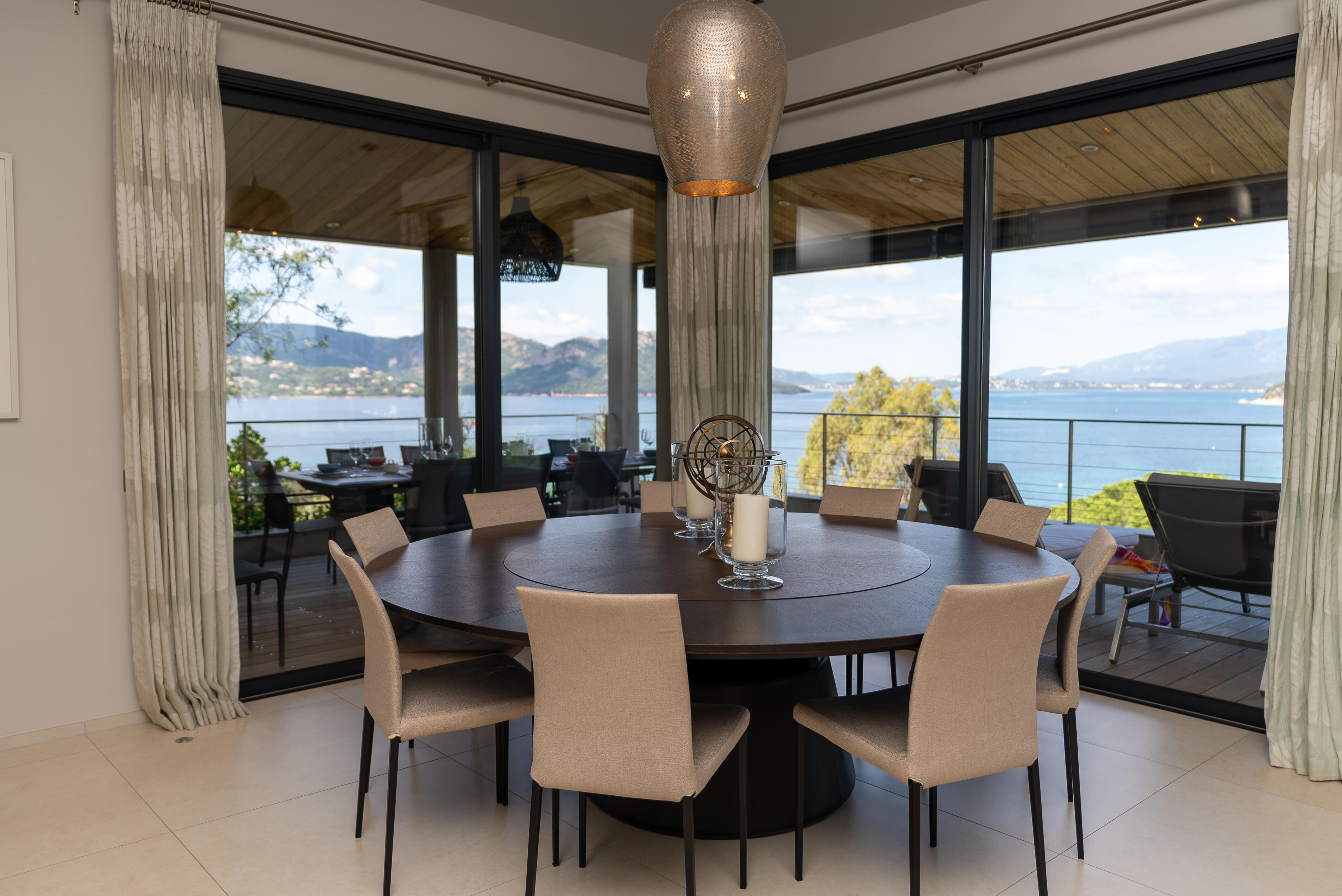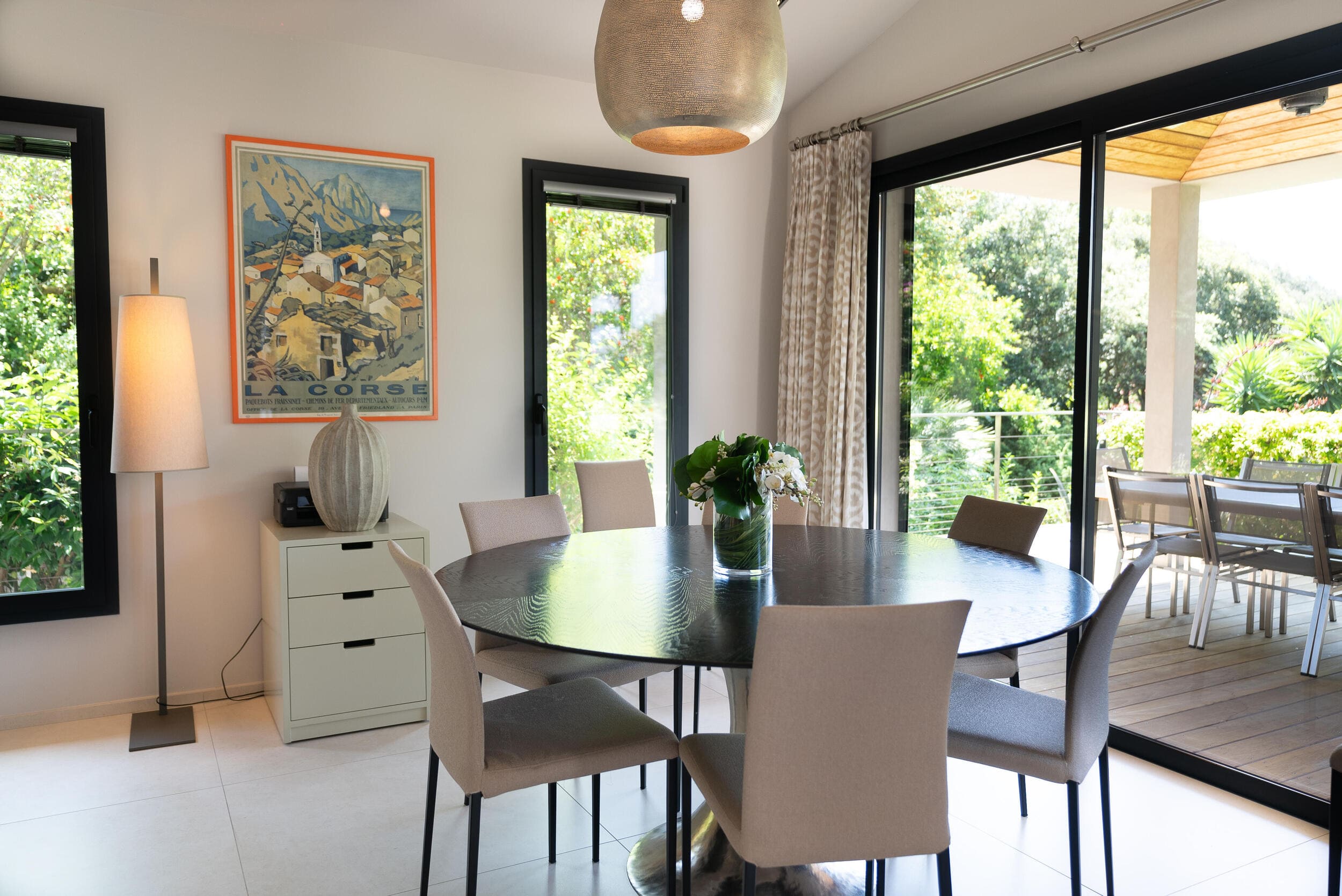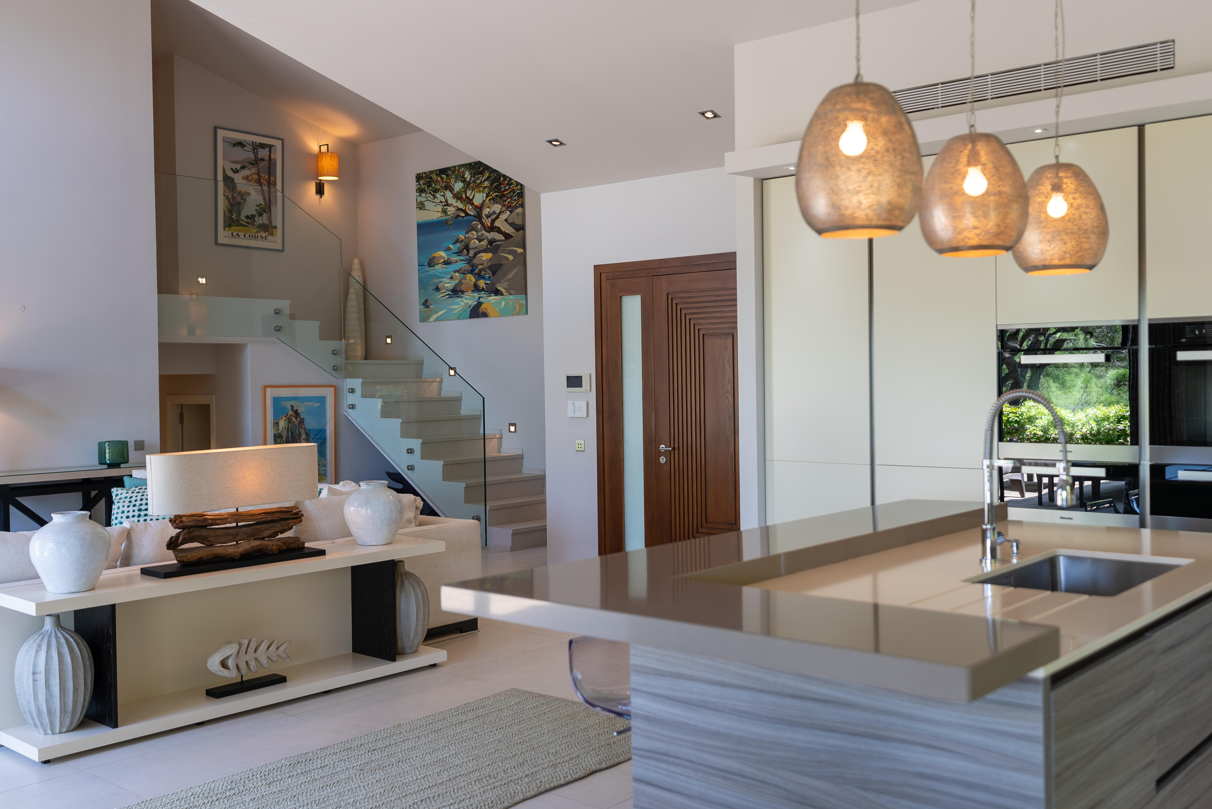La Villa BEX vous enivrera de sa beauté: en arrivant sur place vous serez accueilli par un magnifique enrochement aménagé d’essences locales tels que les palmiers, oliviers, romarin, immortelles, ….un véritable plaisir pour l’odorat et la vue.En poussant la porte d’entrée laissez – vous charmer par la vue mer à couper le souffle sur le golfe de Porto-Vecchio.La villa se dévoile sur trois niveaux:*Au niveau principal double salon/TV avec salle à manger, cuisine entièrement équipée et aménagée, cellier, vestiaire pour invités avec WC et lave main. Le tout donnant accès à une grande terrasse semi couverte et agrémentée d’une table d’extérieure/barbecue*Un escalier permet d’accéder au niveau inférieur qui est l’espace nuit de la villa: 4 chambres magnifiquement décorées vous attendent avec la buanderie qui est entièrement équipée et aménagée. Les chambres se composent comme suit:Chambre 1 : Master Room avec lit en 180X200 cm, grand dressing, salle de bain (douche + baignoire), WC, terrasse permettant d’accéder à la piscine.Chambre 2 :lit en 180 cm, placard, séparément salle d'eau avec WC, terrasse avec accès piscineChambre 3 : lit en 180 cm, dressing, terrasse et salle d’eau avec WC.Chambre 4: lit en 180 cm, dressing séparé, salle de bain (douche + baignoire) avec WC *Enfin un escalier vous permet d’accéder au rez de jardin qui est un véritable espace détente: salle de sport, salle de massage et pool house. - Cuisine intérieure d’été entièrement équipée et aménagée. - Vous aurez accès à une terrasse semi couverte pour profiter pleinement des joies de la farniente. - La piscine dispose d’une protection enfant (rideau roulant), transat et parasols. - Une douche extérieure est également présente. L’ambiance est réellement reposante, dépaysante et charmante. La villa GRYON, alliant classicisme et modernisme, offre des prestations très haut de gamme, tant dans le mobilier que dans le choix des détails et se compose comme suit:*L'entrée se fait par une approche totalement verdoyante avec un véritable jardin d'Eden: plantes endémiques et exotiques vous mènent via un dallage de pierres de Brando à la porte d'entrée en bois massif: un hall d'entrée vous accueille vers une pièce de vie principale en total open space très lumineux: grand salon d'angle, TV avec chaines satellites, salle à manger, cuisine ouverte avec comptoir. Cette dernière, entièrement aménagée et équipée dispose de tous les éléments nécessaires: double four, double chauffe plat, plaque vitro céramique, machine à café Nespresso... Attenant se trouve un cellier avec cave à vin.*L'espace nuit se compose de 4 chambres (+ 1 pour enfant avec llit en 90 cm ou dite de service):A l'étage se trouve la Master Room de la villa avec lit en 180X200 cm, TV avec Apple TV, dressing indépendant, coffre fort, terrasse privative avec vue jardin et mer. Salle de bain avec douche et baignoire, double vasque, WCAu 1/2 niveau inférieur se trouve:un WC invitéchambre 2: lit en 140 cm, placard, salle d'eau avec WC, terrassechambre 3: lit en 180 cm, placard, terrasse et salle de bain (douche + baignoire) avec WC commun avec la chambre dite de 'service' ou destiné à un petit enfant (lit en 90 cm):chambre 4: accès extérieur et indépendant, lit en 140 cm salle d'eau avec WC. Par cet accès extérieur et indépendant de la villa vous aurez également à disposition un cellier avec cave à vin, réfrigérateur, une buanderie totalement équipée et aménagée et surtout une salle de cinéma disposant de deux canapés confortables. Cette chambre peut être destiné à du personnel de service.Les espaces extérieurs sont agrémentés d'essences locales et plus exotiques: vous serez charmés par l'ambiance qui en ressort, un coin été est également prévu avec une table extérieure ombragée. L'accès à la plage se fait en moins de 5 minutes à pied via le jardin des villas.